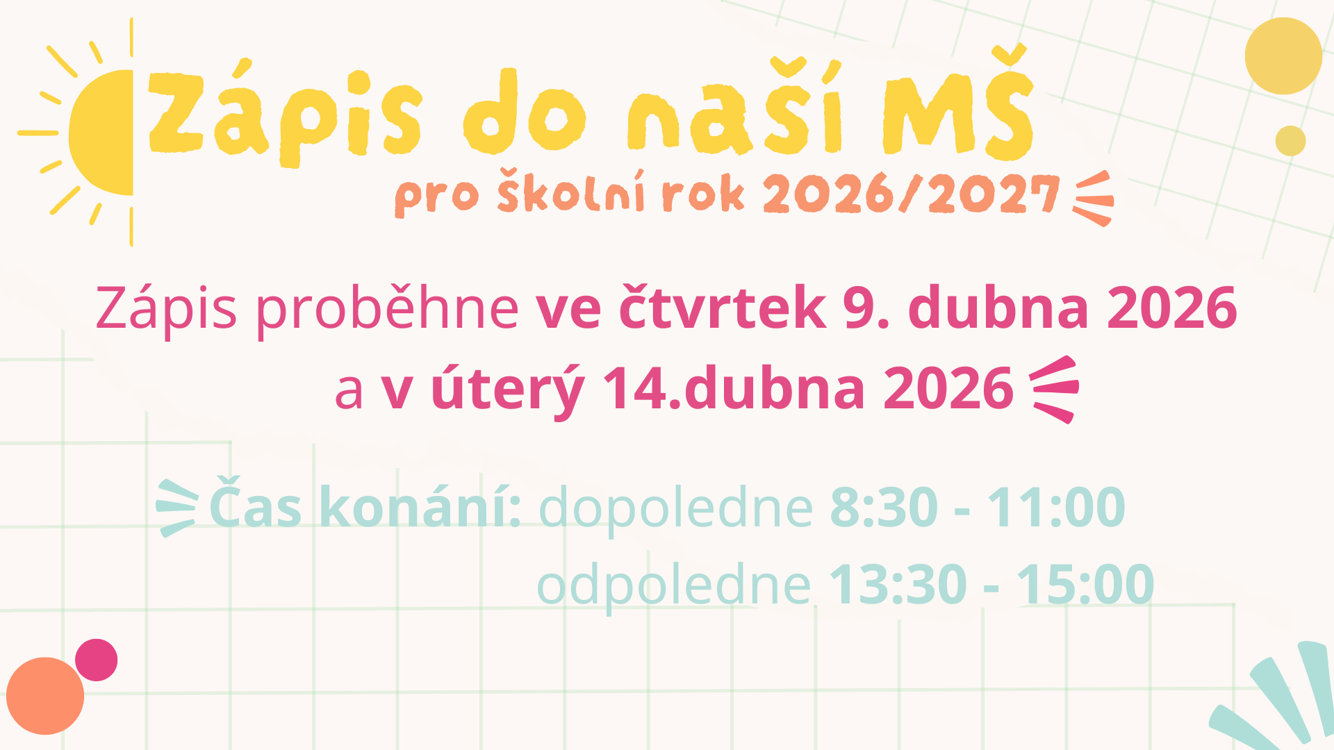 zápis do mateřské školy na školní rok 2026/2027 proběhne ve dnech 9.4.2026 a 14.4.2026 .
